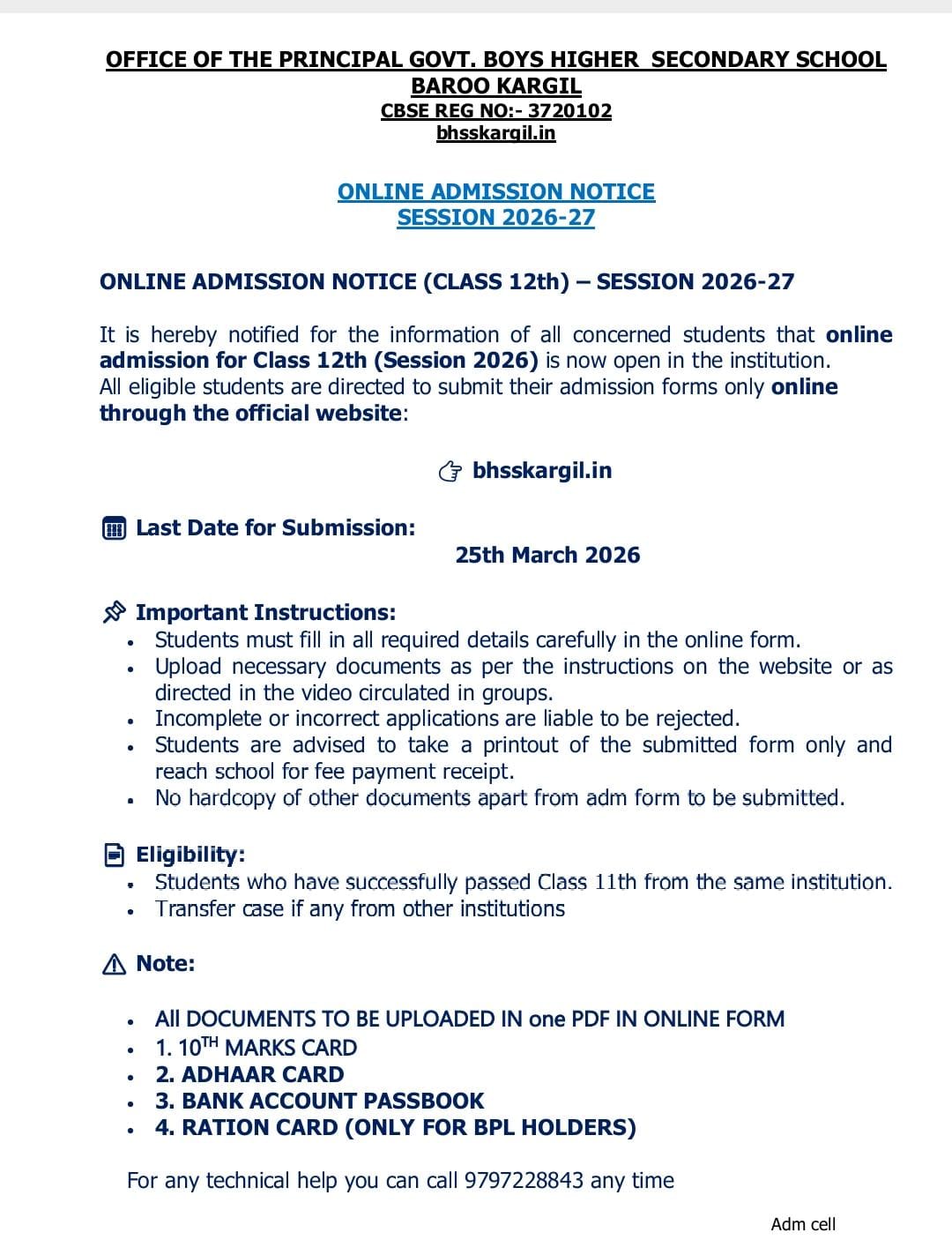 ADMISSION TO CLASS 11th and 12TH SESSION 2026-27 STARTED ..LAST DATE IS 25-03-2026